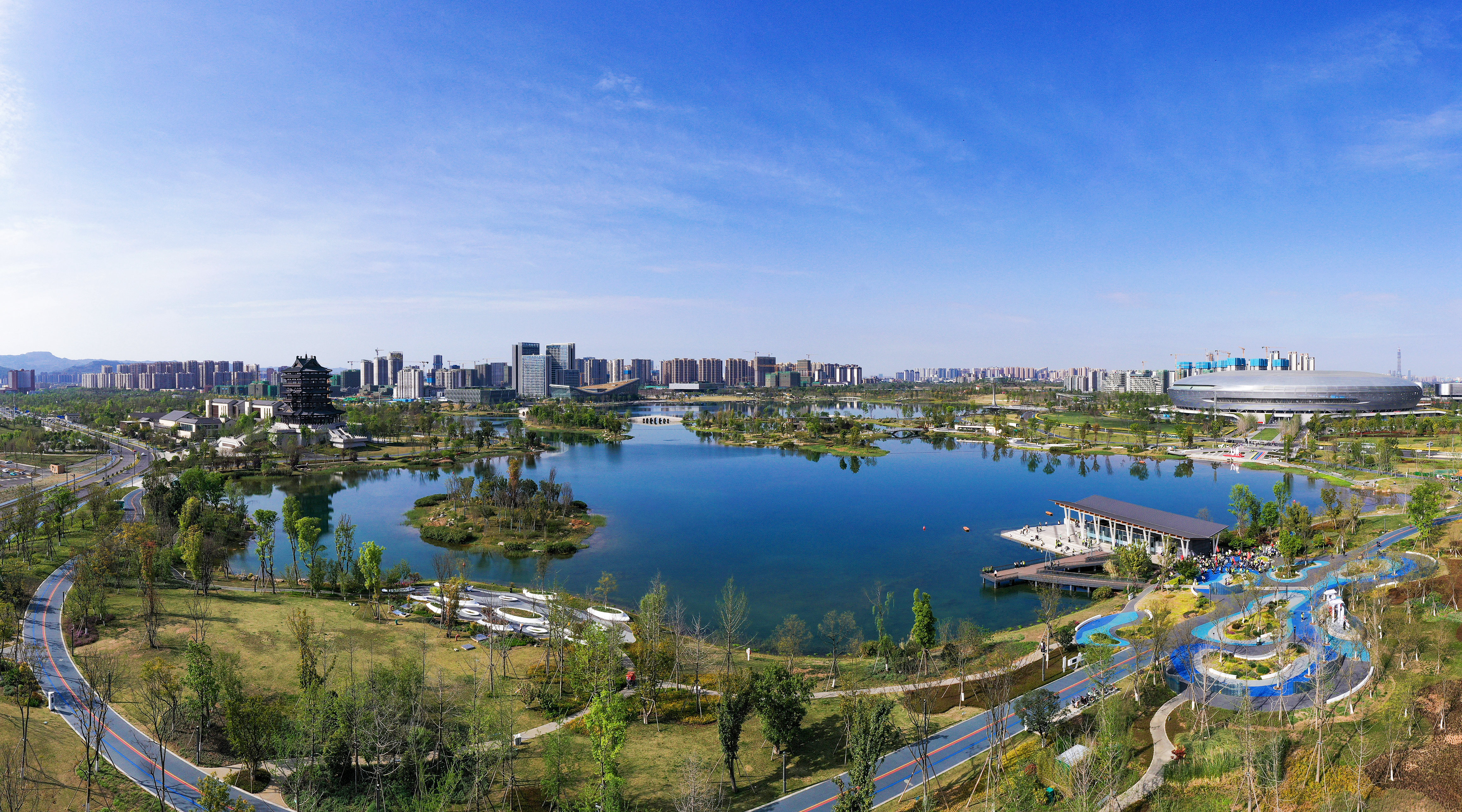 中国五冶牵头完成的“世界大运会东安湖体育公园项目”占地面积5984亩,建设内容含270万m3水库、346万m2水陆生态系统、7.4km市政道路(含湖底隧道1.7km,市政桥梁9座)、11.25km绿道、25座景观桥梁、49栋建筑及57处构筑物等,是第31届世界大运会开幕式举办地,是首批践行“把生态价值考虑进去”的国家公园城市建设项目,是成渝地区双城经济圈的重要生态支点。